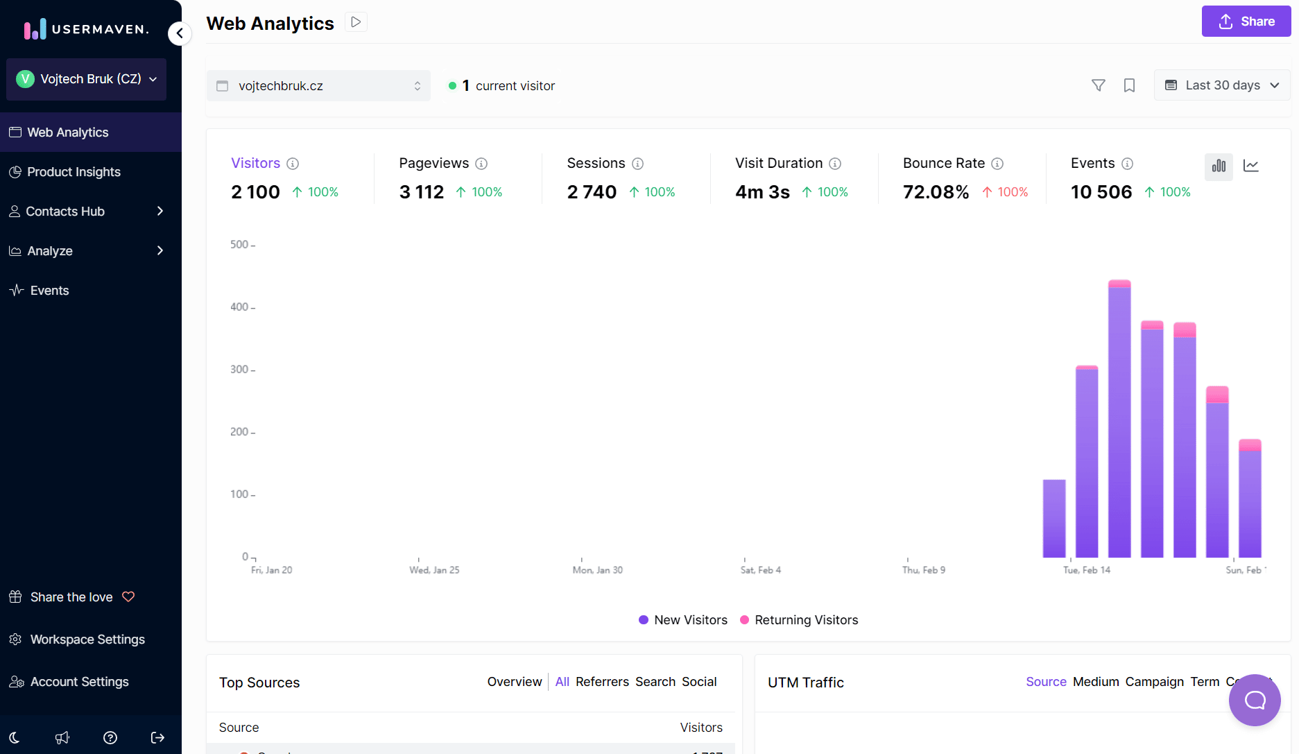 Dnes už nebude povinný panel so súbormi cookie na webe pútať pozornosť. Ak návštevník nebude chcieť, aby sa o ňom zhromažďovali osobné údaje, bude to tak. Vďaka používaniu webovej analytiky bez súborov cookie (nástroj Usermaven)